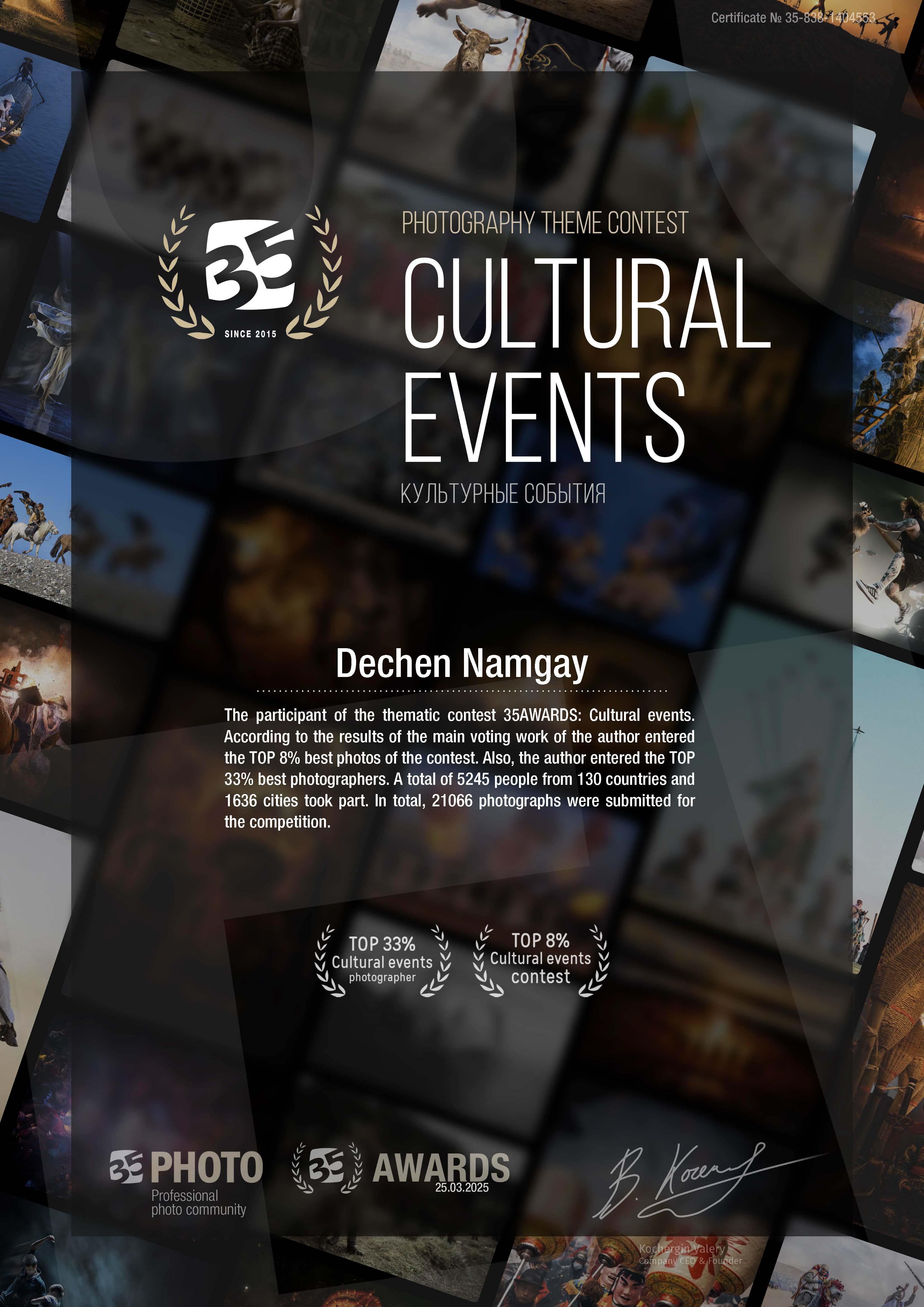 35AWARDS – Cultural Events Photography Contest Recognized as a standout participant in the prestigious 35AWARDS Thematic Contest: Cultural Events. Ranked in the Top 8% of Best Photos among over 21,000 submissions Placed in the Top 33% of Best Photographers worldwide The contest saw participation from 5,245 photographers across 130 countries and 1,636 cities This international recognition highlights both the artistic and cultural depth of the submitted work.
